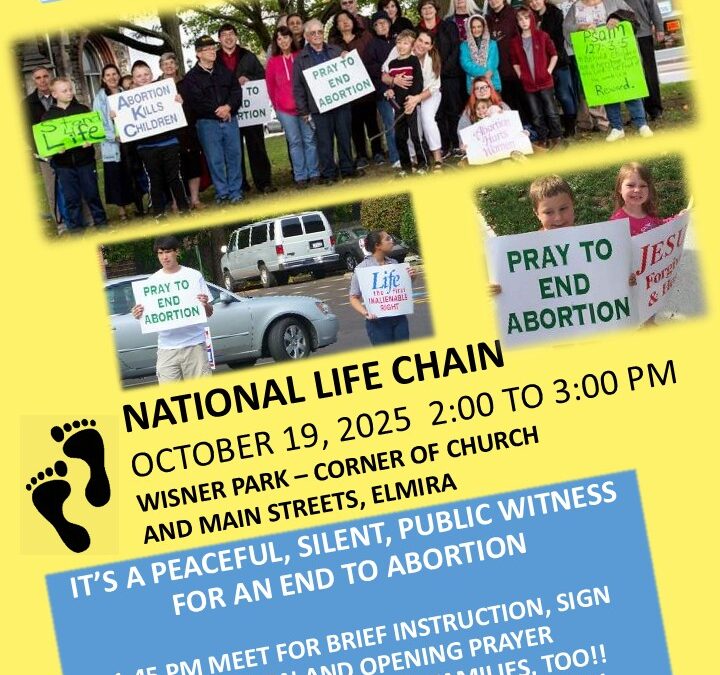 Life Chain is a peaceful, public, Pro-Life demonstration where participants stand for one hour on a designated sidewalk to pray and advocate for the sanctity of human life.  The first Life Chain was held in California in 1987 and has spread across the USA, Canada and many other countries across the World. People hold signs with messages like "You are not alone", "Jesus Heals and Forgives", "Abortion Hurts Women", "Pray to End Abortion" and several others.  We provide information about free resources for pregnant individuals and couples troubled with an unplanned pregnancy as well as those who seek healing after an abortion.  By praying and encouraging others to pray, we ask God to help end abortion as well as the need for it.
